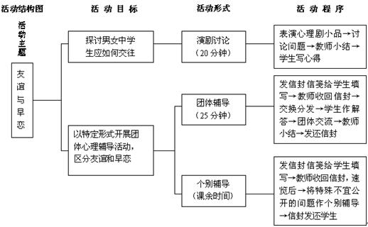 1、班委将准备好的信封、信笺发给每一位同学,要求学生在信笺上给“知心姐姐”写一句话或简短的一段话,内容是自己交友(同性朋友、异性朋友均可)出现的疑难问题,或是身陷早恋后面临的困惑等,为了保证学生们都能写出心理话,所以信笺以不记名形式填写,但要在自己的信封上留下记号,以便发还留念;